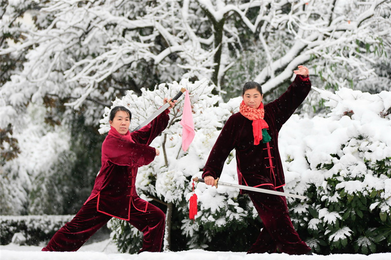 2月8日,市民在江苏省淮安市盱眙县第一山国家森林公园冒雪晨练。新华社发(周海军 摄)