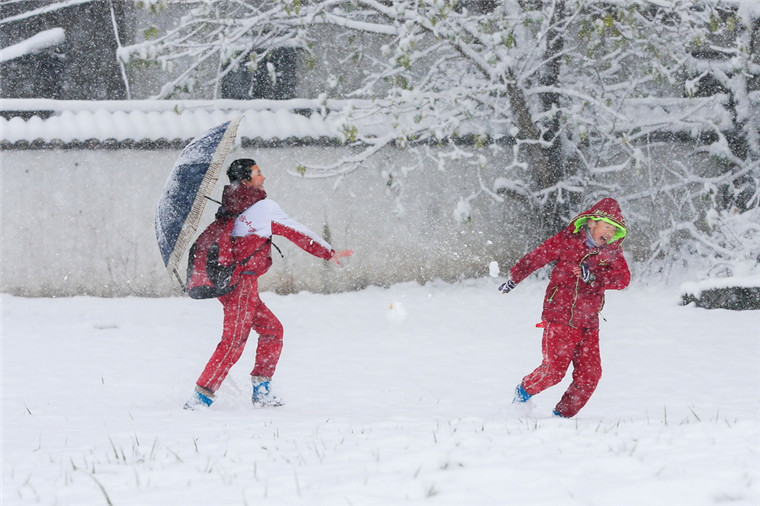 2月8日,在江苏省淮安市盱眙县淮河记事园,两名孩子在雪中玩耍。 新华社发(周海军 摄)