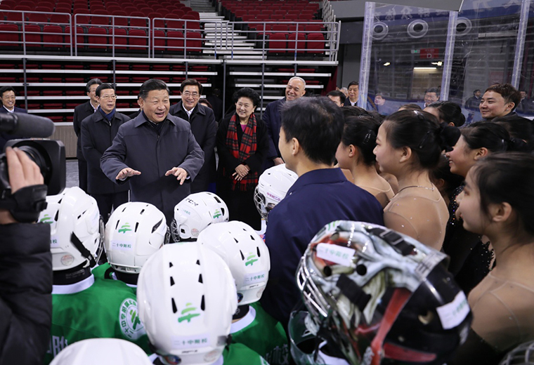 2月23日至24日,中共中央总书记、国家主席、中央军委主席习近平在北京考察。这是24日上午,习近平在五棵松体育中心热情勉励青少年冰球和队列滑爱好者们。新华社记者 兰红光 摄