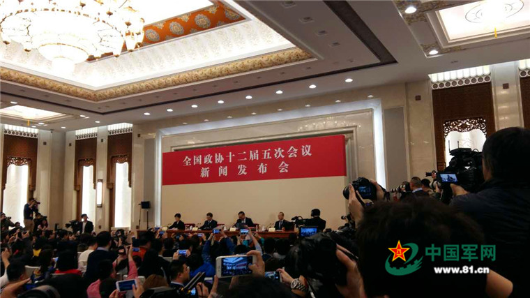 3月2日下午3时,全国政协十二届五次会议在北京人民大会堂举行首场新闻发布会,大会新闻发言人王国庆向中外媒体介绍会议有关情况并回答记者提问。(中国军网记者李娴、毛志文摄影报道)