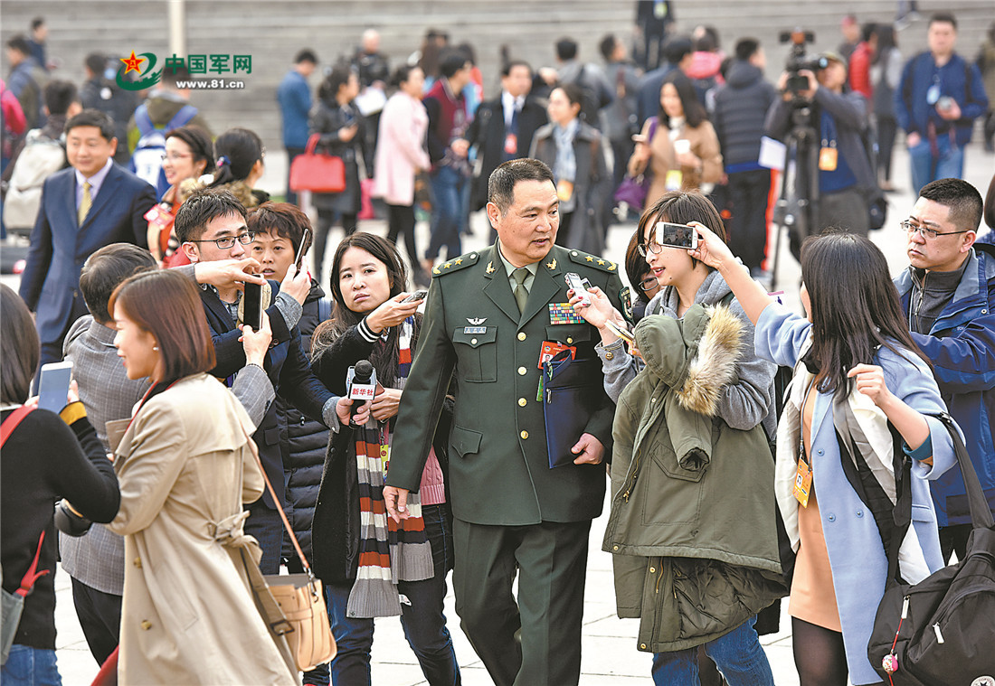 3月3日下午,全国政协十二届五次会议在北京人民大会堂开幕。图为开幕会后,军队政协委员王洪光接受记者采访。解放军报记者 穆瑞林摄