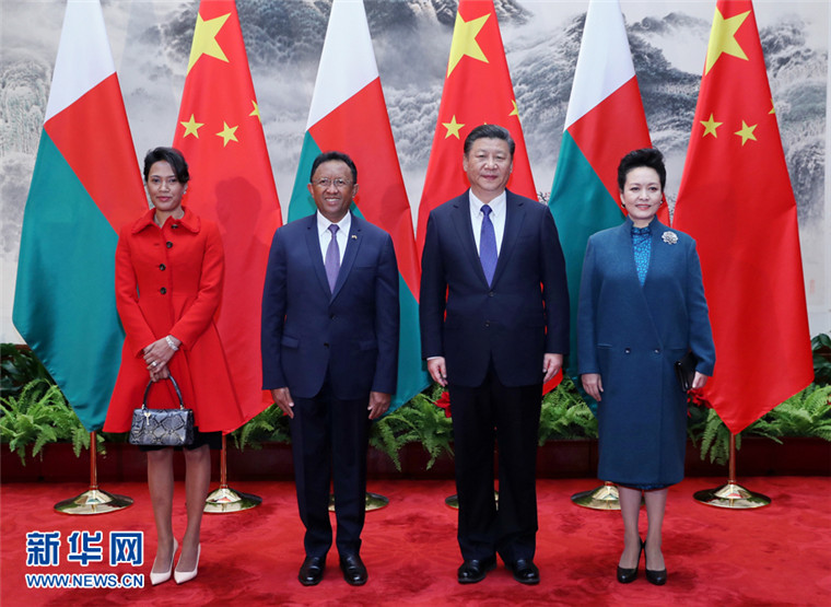 3月27日,国家主席习近平在北京人民大会堂同马达加斯加总统埃里举行会谈。会谈前,习近平在人民大会堂东门外广场为埃里举行欢迎仪式。这是习近平和夫人彭丽媛同埃里总统夫妇合影。新华社记者 鞠鹏 摄