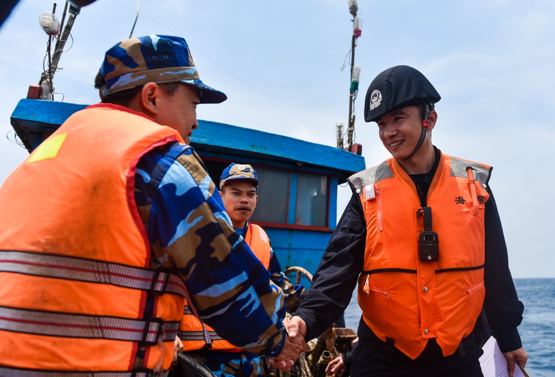 4月18日,在一艘越南渔船上,中国海警(右)和越南海警在联合检查前握手致意。新华社记者