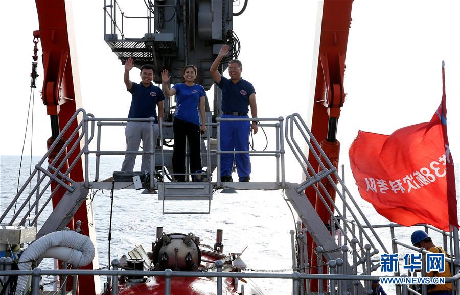 4月29日,潜航员唐嘉陵,主驾驶、女实习潜航员张奕,随“蛟龙”号第一次下潜的科学家石学法(从左至右)深潜归来。新华社记者 刘诗平 摄