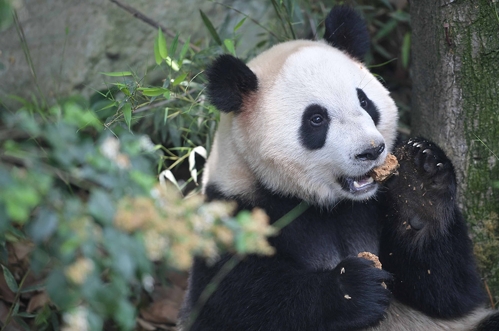5月4日,在成都大熊猫繁育研究基地,大熊猫“和兴”在进食。新华社记者 薛玉斌 摄