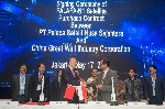 5月17日,在印度尼西亚首都雅加达,中国长城工业集团有限公司总裁殷礼明(前左)与印尼“PSNS”卫星运营公司代表签署“帕拉帕-N1”(PALAPA-N1)通信卫星项目合同。 新华社记者杜宇摄