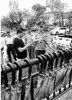 22日,约有5万把共享雨伞现身杭州街头,它们分布在杭城的火车站、地铁站、商场等公共区域。在武林广场地铁站出口,市民们尝试通过手机扫描、身份认证、交押金充值等步骤,对共享雨伞解锁。获得使用权后,共享雨伞租金为半小时五毛钱。