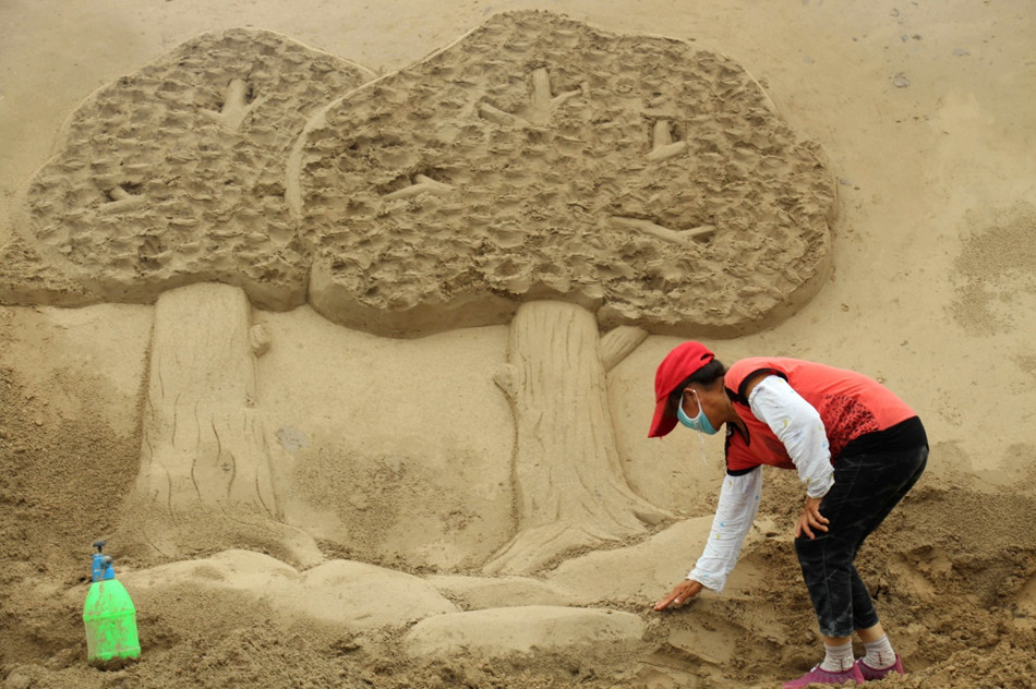 7月19日,沙雕艺术家在山东省滨州市高新区沙雕主题公园创作。