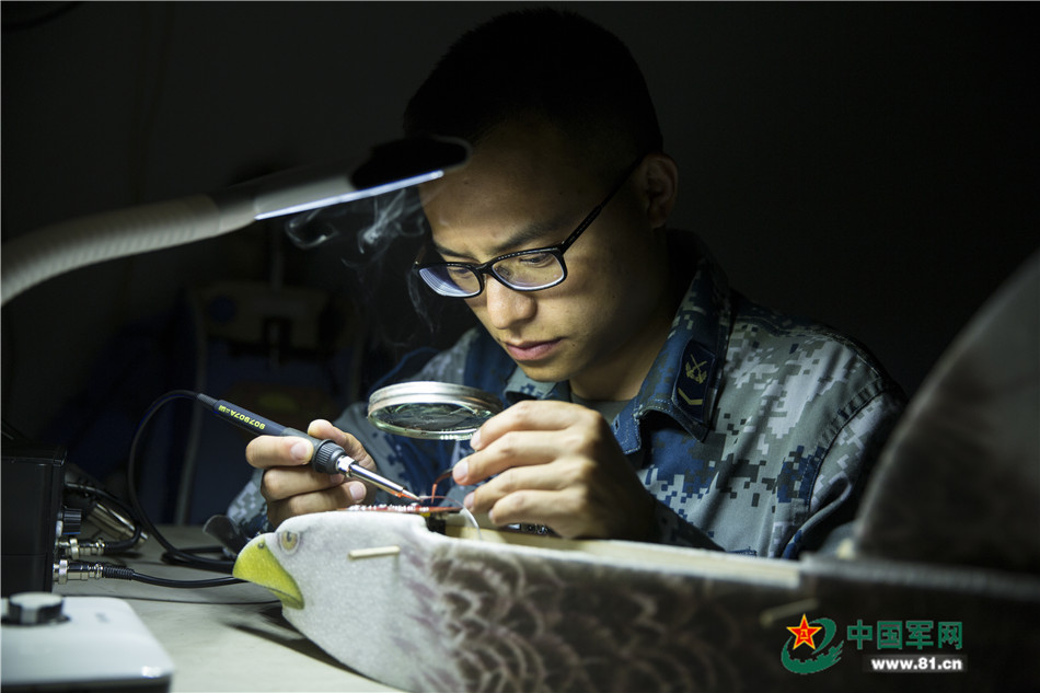 曹宇在夜深人静时抓紧时间制作航模飞机。