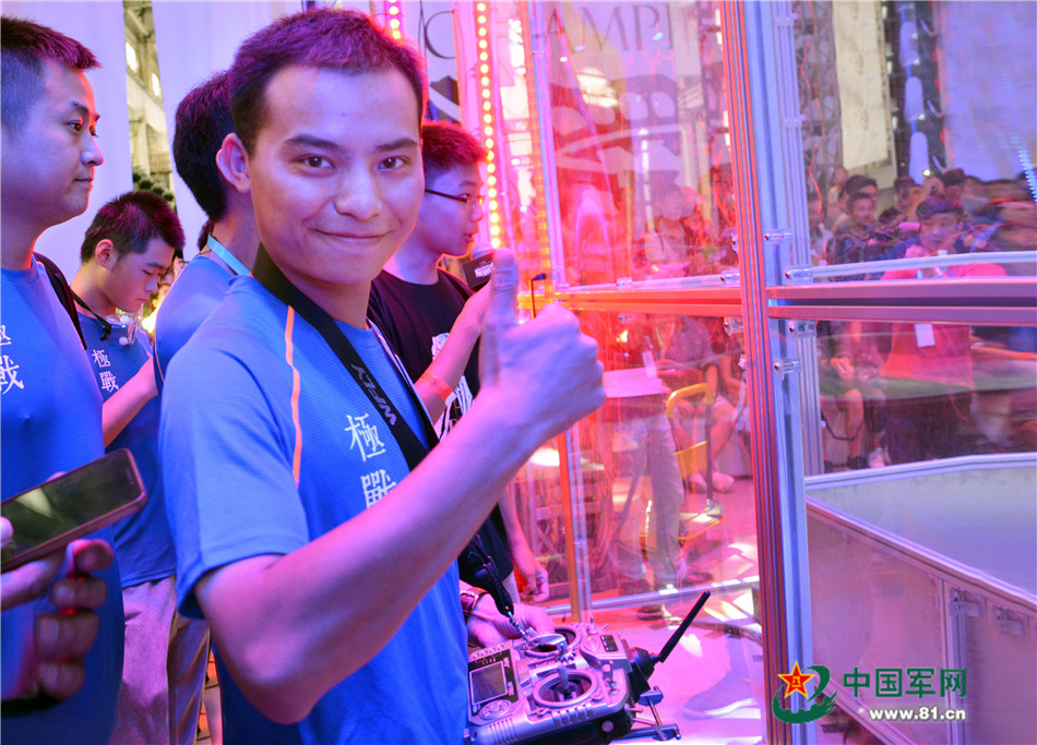 2017年1月,曹宇全国机器人格斗大赛现场操纵自制机器人比赛。