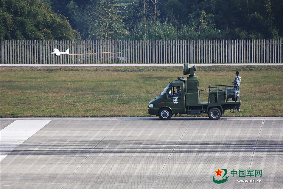 飞行训练前,曹宇操纵自己制作的航模在跑道上搜索驱鸟。