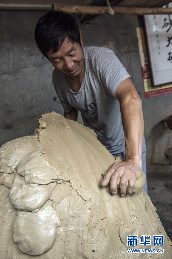 孙德民在工作坊揉泥。揉泥是砂大碗碗坯制作的一个关键工序。