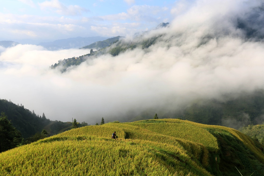 秋高气爽时节,贵州省榕江县水稻陆续成熟,层层叠叠的梯田透露着丰收的气息。