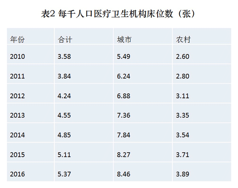 医疗卫生服务体系资源要素持续增加。2011年至2015年,国家投入420亿元,重点支持建设1500多个县级医院、1.8万个乡镇卫生院、10余万个村卫生室和社区卫生服务中心。截至2016年底,全国医疗卫生机构达983394个,其中医院29140个(公立医院12708个,民营医院16432个),乡镇卫生院36795个,社区卫生服务中心(站)34327个,疾病预防控制中心3481个,卫生监督所(中心)2986个,村卫生室638763个;全国统计的万元以上医疗设备共529.1万台,其中100万元以上的设备12.5万台。2016年,医疗机构床位数比2015年增加39.5万张,每千人口拥有床位数达到5.37张,医院床位数增加35.8万张;全国少数民族医医院有266所,床位数达26484张,年总诊疗968.7万人次,出院58.8万人次。