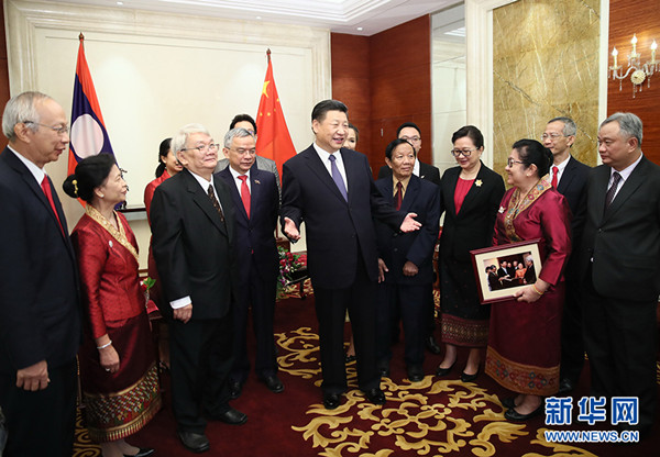 2017年11月14日,习近平在万象下榻饭店会见老挝奔舍那家族友人。新华社记者 王晔 摄