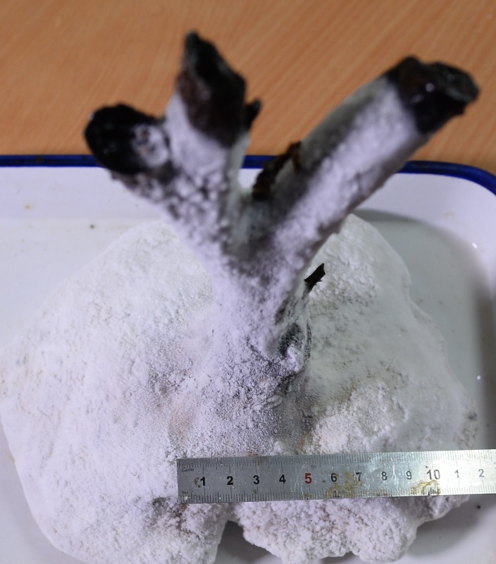 这是“发现”号遥控无人潜水器在西太平洋卡罗琳海山采集的巨大珊瑚的根部,专家推测其年龄超过万年(9月4日摄)。新华社记者 张旭东 摄