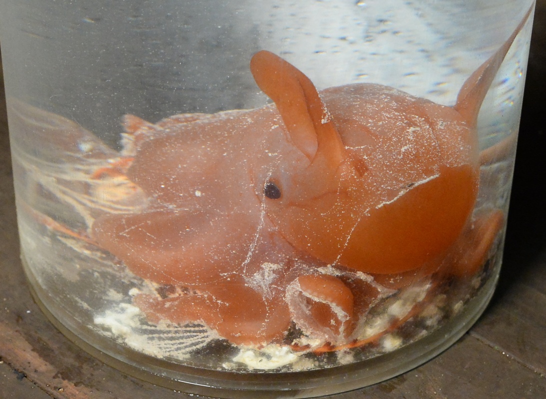 在西太平洋的卡罗琳海山,“发现”号还抓取了一只“萌萌哒”的深海“小飞象”,它的两个鳍如大象的两个耳朵,在水中摇曳。其实这只“小飞象”和预测世界杯的“保罗”是一家,都是章鱼,只不过“小飞象”是烟灰蛸属章鱼,非常罕见。