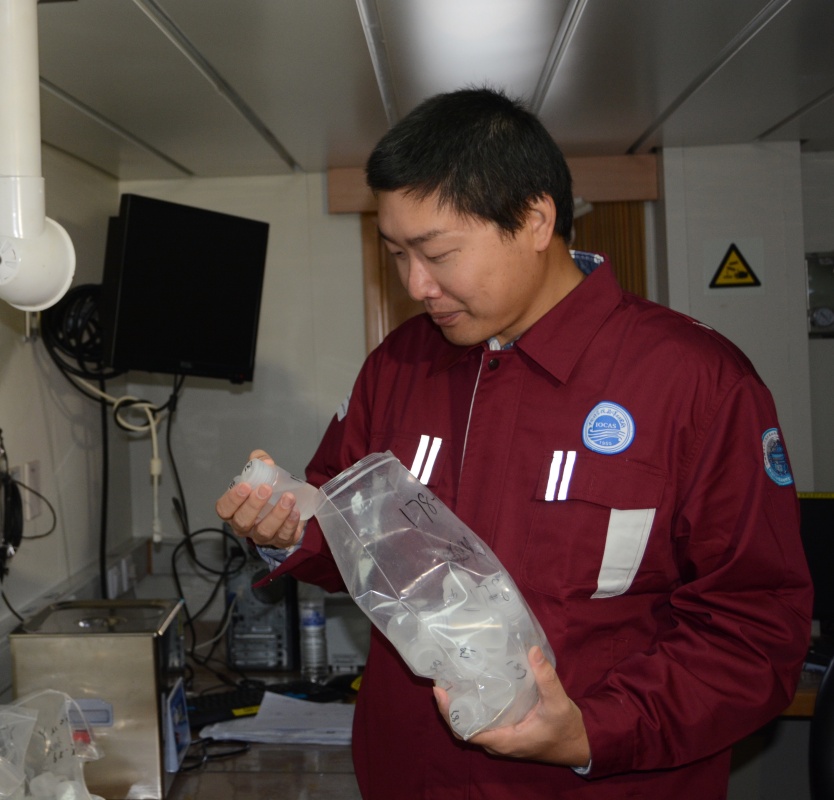 中国科学院海洋研究所副研究员汪嘉宁在科考船上查看样品(1月2日摄)。新华社记者 张旭东 摄