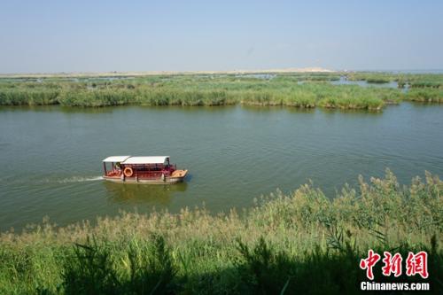 宁夏沙湖旅游景区内,游船在湖面上行驶。 姜雨薇 摄
