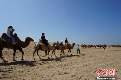 游人在沙湖景区的沙山上骑骆驼观光。 姜雨薇 摄