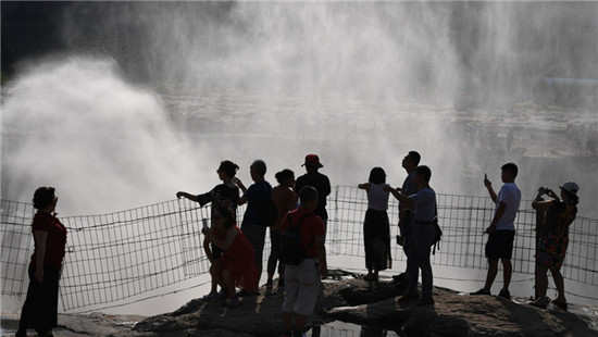万里黄河流经晋陕峡谷到达吉县境内,水面由三四百米宽骤然收缩为50多米,跌入落差30多米深的石槽中,形若巨壶注水,故名壶口瀑布。