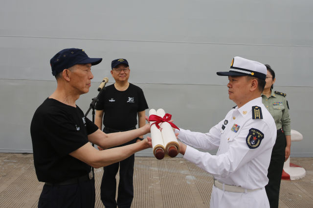 原511舰舰长李双保向夏志法支队长转交军旗。高嵩 摄