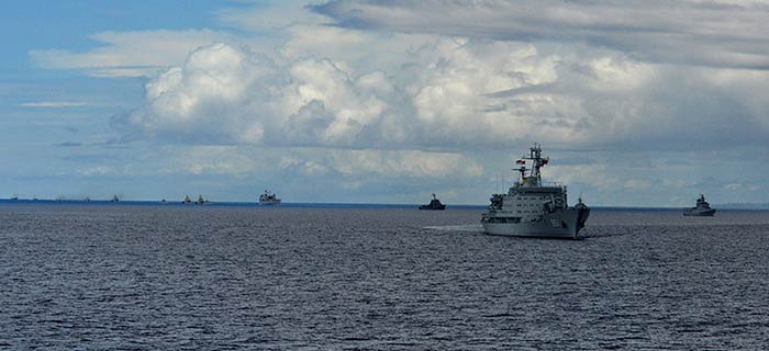 4月11日上午,赴印度尼西亚参加“科摩多-2016”联合演习的中国海军舰艇编队抵达印尼巴东港外汇合点,并在锚地和其他国家的40多艘舰艇顺利完成集结。科摩多