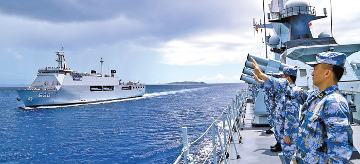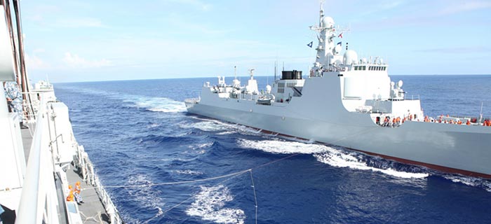 当地时间6月23日上午,我海军参加“环太平洋-2016”演习任务的舰艇编队在太平洋某海域展开出航以来首次海上航行补给。环太军演,