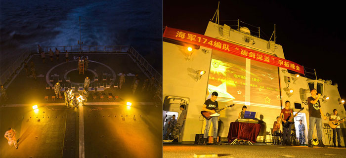 途中,官兵自导自演在后甲板直升机起降平台上举行了一场“砺剑深蓝”甲板晚会。南海舰队,“合肥”号导弹驱逐舰