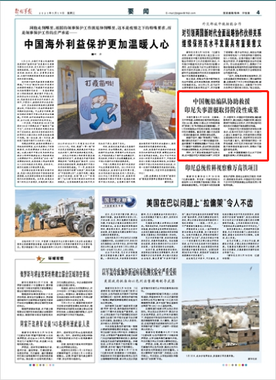 中国驻印尼大使馆国防武官陈永靖表示,这是中印尼双方进行的一次重大人道主义救援行动,对巩固和深化两国全面战略伙伴关系,促进两军互信互助与合作意义重大。面对深海打捞这一世界性难题,中印尼双方相关部门和任务船只保持紧密沟通与协作,取得水下勘查阶段性成果。