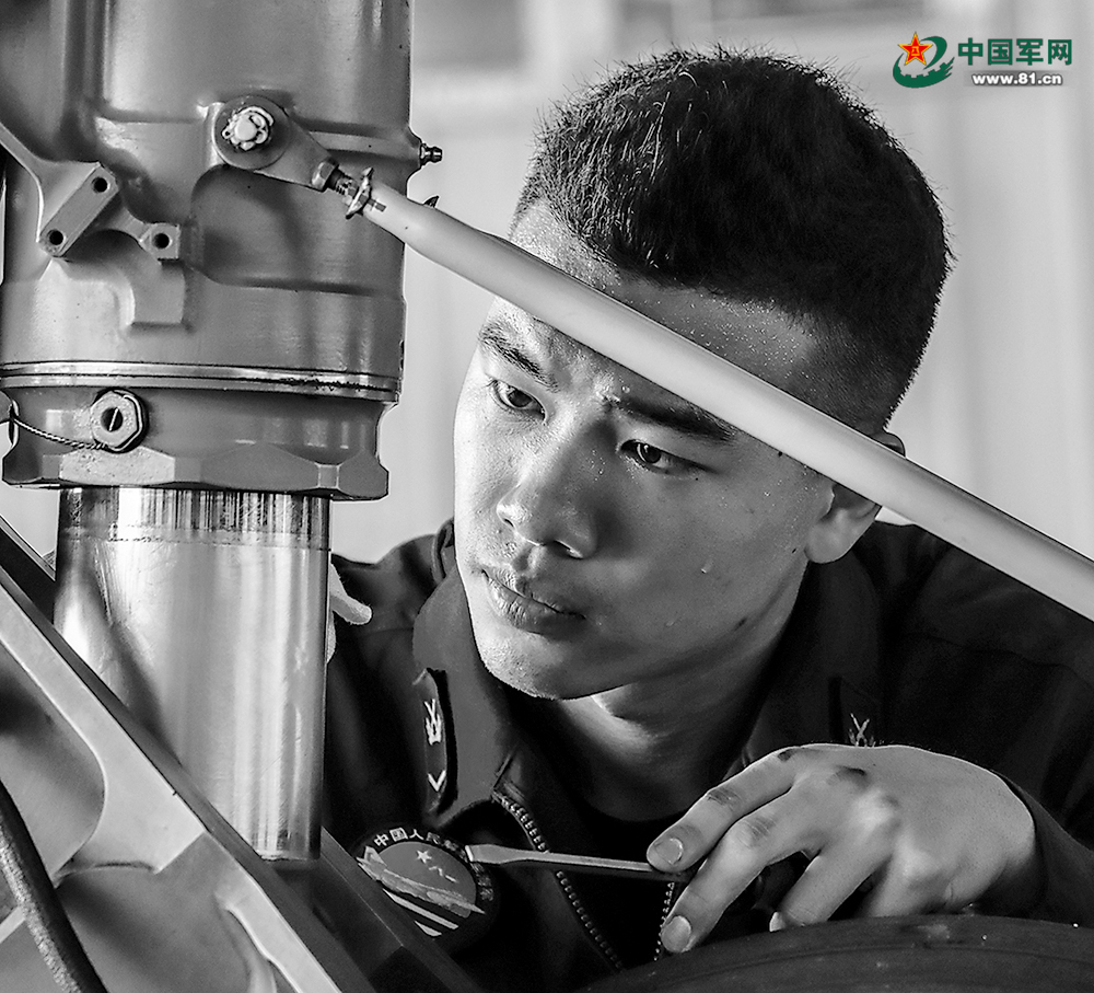 机务官兵对战机进行维护保障。