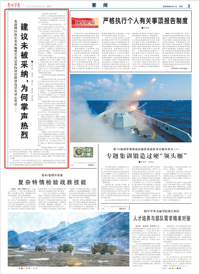 前不久,北部战区海军某基地机关基层双向讲评会上,该基地领导未采纳一名基层教导员所提建议的一幕,在官兵中引发热议。