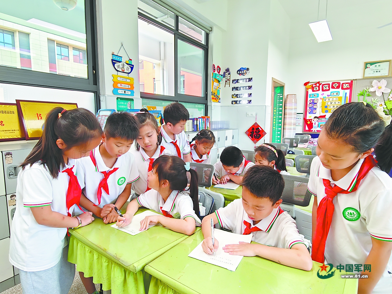 湖南省长沙市天心区湘府英才益清小学2106班星光中队小学生在主题队会上给岛礁官兵们写信。彭靓艺摄