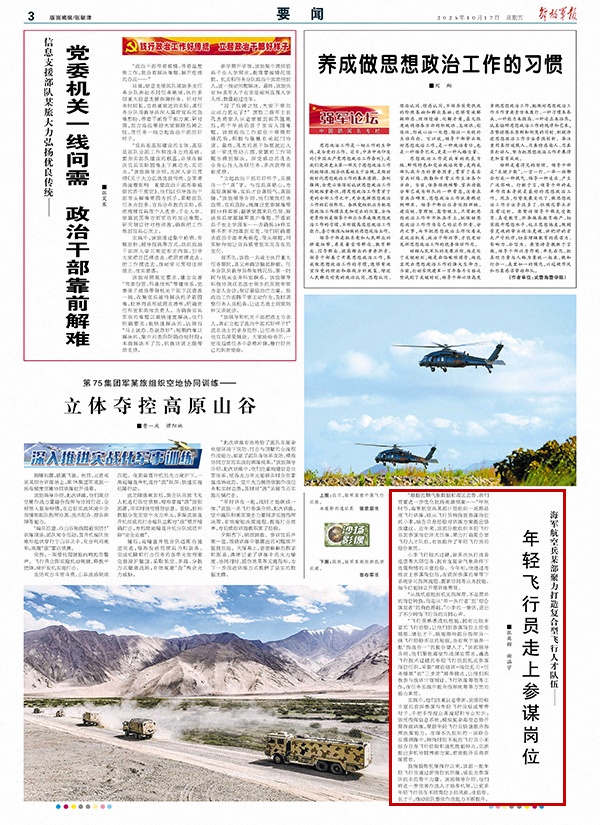 “根据近期气象数据和海区态势,我们需要进一步优化航线规避预案……”仲秋时节,海军航空兵某部计划组织一场跨昼夜飞行训练,刚从飞行员转岗到参谋岗位的小李,结合自身经验对训练方案提出修改建议。近年来,该部分批组织年轻飞行员到参谋岗位淬火历练,聚力打造复合型飞行人才队伍,有效提升了年轻飞行员的综合素质。
