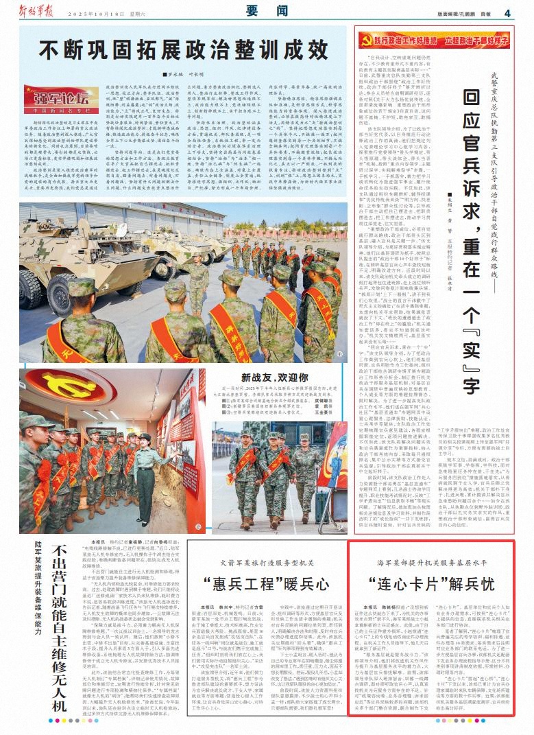 “服务基层就是服务战斗力。”该部领导介绍,他们将改进机关作风作为提升为基层服务水平的着力点,大力为基层官兵排忧解难。前期,该部领导带队深入班排宿舍、训练一线蹲点调研,面对面听取官兵心声,认真查找机关为兵服务方面存在的不足。针对“政策咨询难、业务办理慢、诉求回应迟”等官兵反映较多的问题,该部机关多个部门整合资源,联合制作下发“连心卡片”。基层单位和官兵个人如有业务办理需求,可按照“连心卡片”上提供的信息,直接联系机关相关业务部门进行咨询。