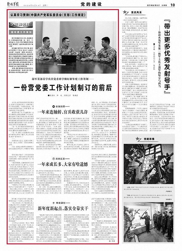 “制订工作计划只是第一步,真正的功夫在纸面之外,在全营官兵行动之中。”新年第一天,边厚忠将这份工作计划贴在办公室最醒目的地方,时刻提醒自己与党委一班人:责任在肩,唯有实干。