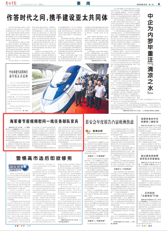 解放军报北京2月12日电 记者钱晓虎、特约记者张懋瑄报道:海军2月12日下午举行视频慰问活动,向春节期间执行任务的第48批护航编队、某潜艇部队、南沙守备部队、某舰载航空兵部队、海军陆战队某分队、海军参谋部某部、驻吉布提保障基地等单位官兵致以节日问候和新春祝福。