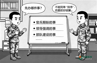 “‘官兵期盼的事’本身也是‘领导关注的事’,为什么要分高低先后?”该部一名党委领导的话,让一些机关党员干部红脸出汗,低下了头。
