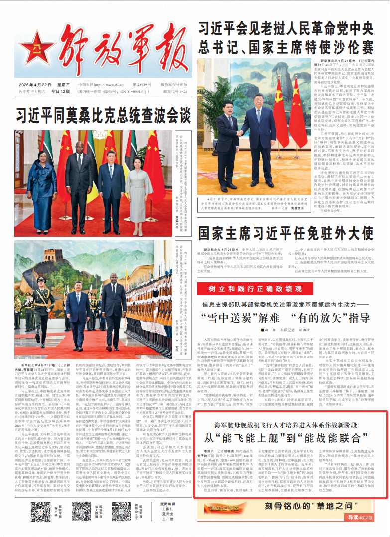 信息共享、联合研练,航母编队体系支撑更加全面的背后,是海军紧盯航母体系作战力量建设要求,对舰载战斗机、直升机、特种机、空中战勤、无人机操控员5类人才的体系锻造。近年来,海军舰载机飞行人才培养进入体系作战新阶段——从“能飞能上舰”到“能战能联合”,按照飞行员、战斗员、指挥员同步培养目标,探索实践新的人才培养路径,走开舰载战斗机、直升机飞行员生长培养新路,全要素优化培养方案、全领域协同保障资源、全流程推进任务落实,形成系统规划、一体推进的人才培养格局。