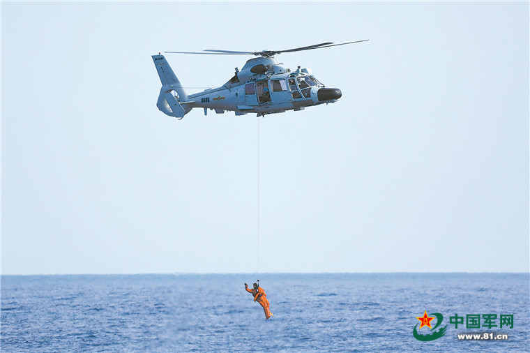 “发现目标,请示吊放救生员进行营救!”在相关海域盘旋搜索约10分钟后,直升机机组发现目标并向编指报告。