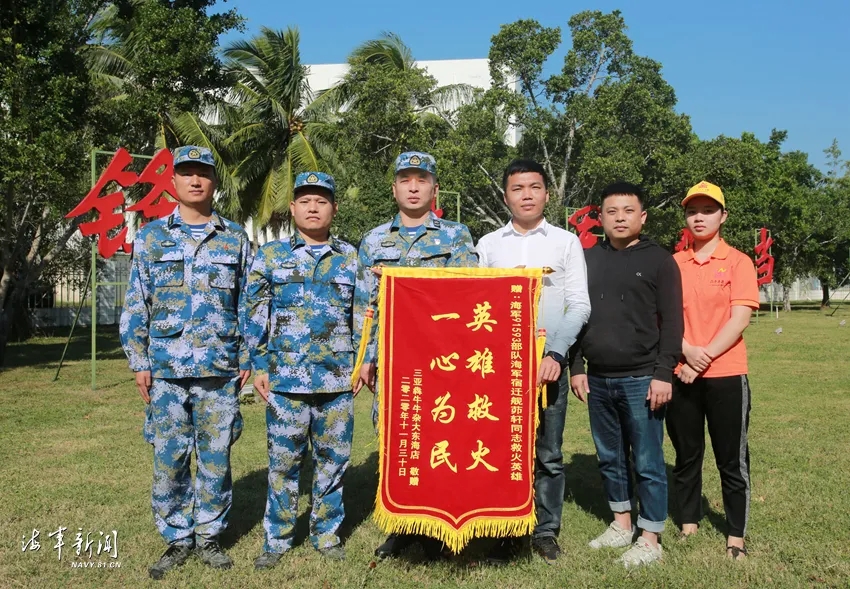 12月5日,三亚某小吃店店主施报龙终于了却一桩心愿:经多方寻找,他终于找到南部战区海军某护卫舰支队,为该支队战士茆轩赠送锦旗,感谢该战士前不久勇敢无畏,科学灭火,保护该店员工生命和财产安全的善举。