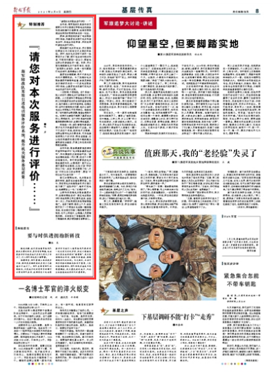 一石投湖,千层浪起。这个系统一投入试运行,便给机关干部带来不小的刺激。人力资源科干事陈铨负责的福利工作和基层官兵的切身利益密切相关,每天都有人询问休假审批、结婚证明、证件办理等相关问题,他办公室的电话从早到晚几乎没消停过。陈铨坦言:“有时真的会很烦躁,情绪会控制不住。但稍不注意就可能寒了基层官兵的心,得到差评。这个评价系统时刻提醒我既要把事办好,还要办得有温度。”