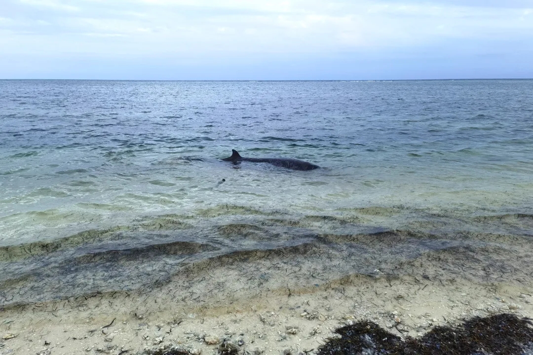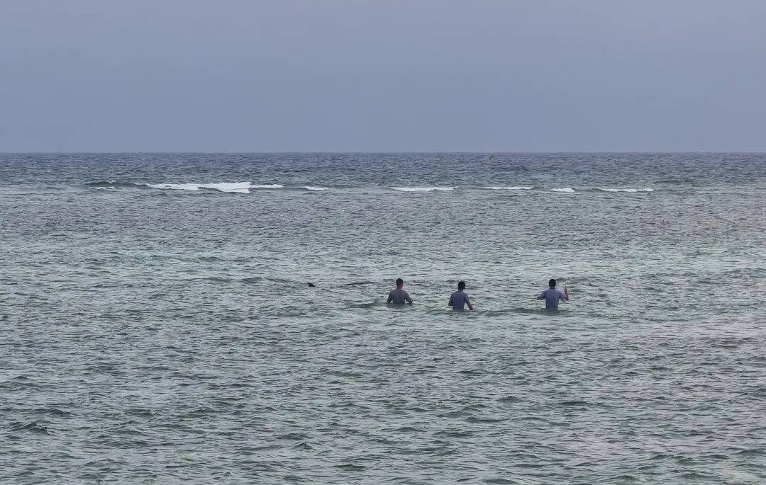 官兵高度警觉,涉水抵近观察。发现是一只大海豚搁浅在礁盘上。战士杨友义介绍:“那只海豚呈深灰色,身长约4米左右,它可能迷路了。”礁盘附近水域较浅,加之白天阳光强烈、温度高,长时间的脱水让海豚看起来奄奄一息,仅凭自身能力难以游回大海。