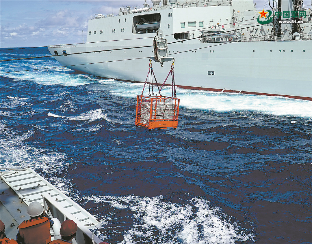银川舰甲板上,官兵奋力拉住查干湖舰发射的引缆,在两舰之间架起承载索后对接输油管线,展开油料补给。随后,干货补给站也开始接收补给。