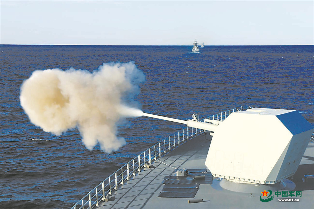 参演舰艇对海上目标射击。