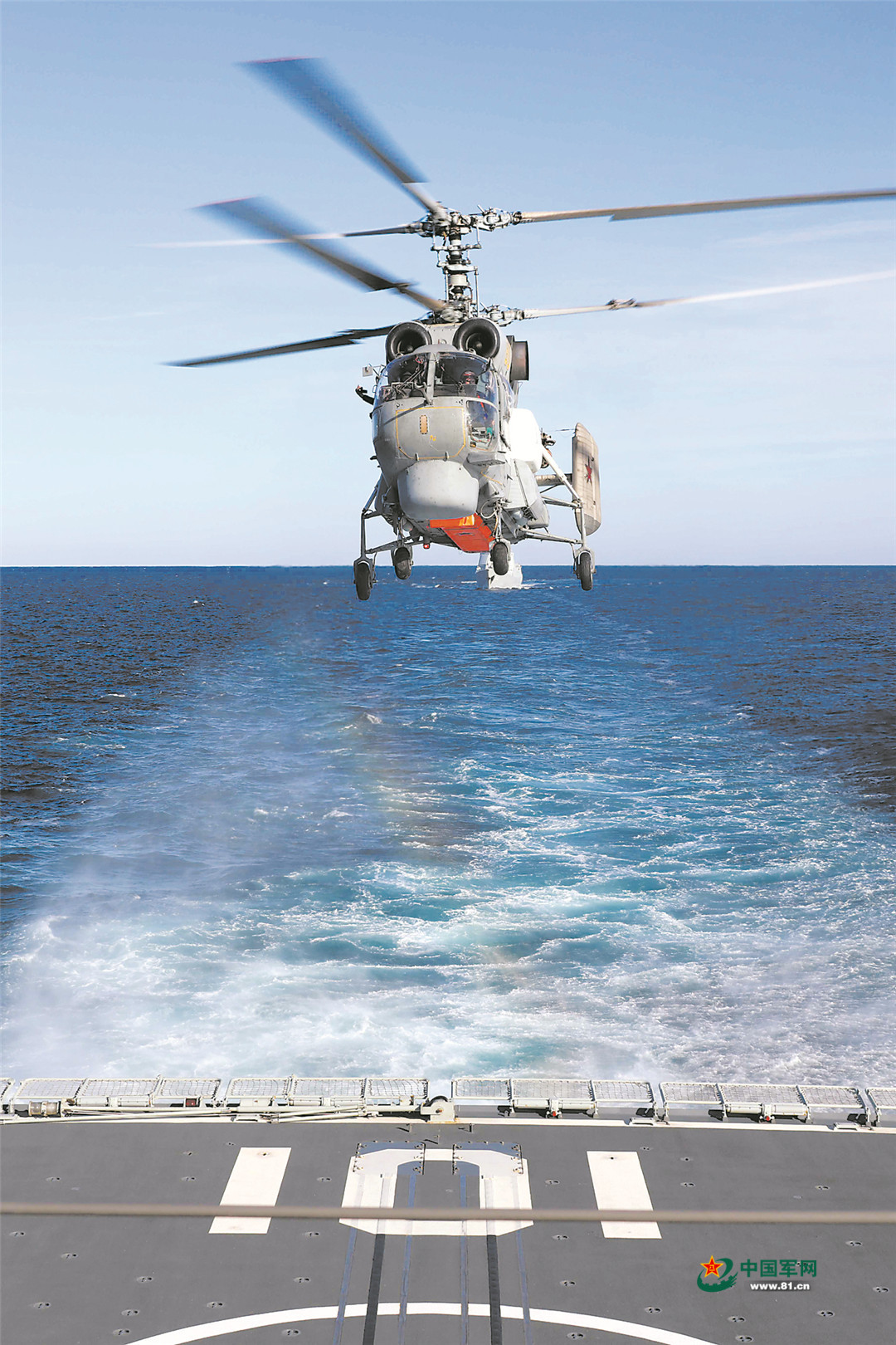 俄方舰载直升机飞临中方舰艇进行模拟着舰演练。