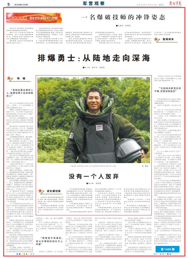 “主动适应新变化还不够,还要加快适应,慢了可能就会被淘汰。”在这种紧迫感的驱动下,白晓贵总结出了一套水下爆破的操作流程和注意事项,帮助其他战友更快掌握该技能。
