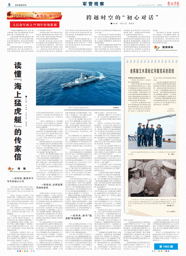 收到信件的老艇长,很快寄来回信。老艇长在信中回忆,当年凯旋时,自己的军装被硝烟熏得发黑,他紧紧攥着一面弹痕累累的军旗:“‘猛虎艇’的虎魂,是在官兵的血性里。看到新一代‘猛虎艇’驰骋深蓝,我不禁热泪盈眶。吨位升级了,装备换代了,‘海上猛虎’的血性不能丢,守好海疆的使命不能忘!”