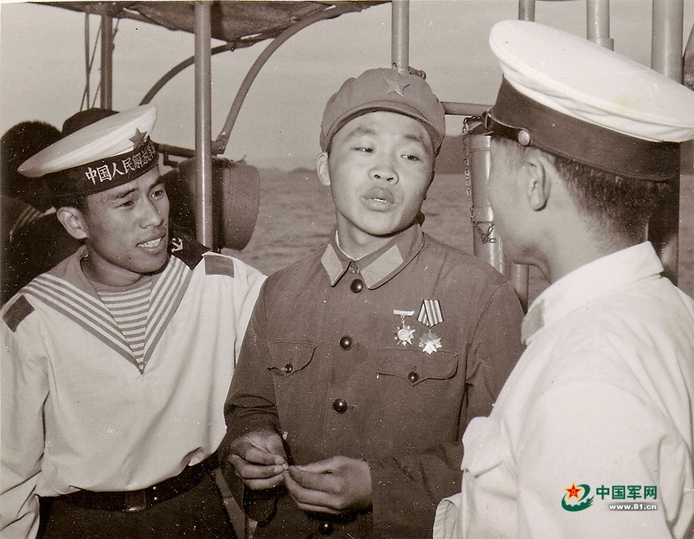 王木昌(左二)当年与战友总结战斗经验。1965年11月,王木昌在崇武以东海战中任588艇轮机班长,在机器冷凝管爆裂的情况下,他用双手卡住滚烫的皮管,以常人难以忍耐的毅力坚持到战斗结束,荣立一等功。刘礼鹏 供图