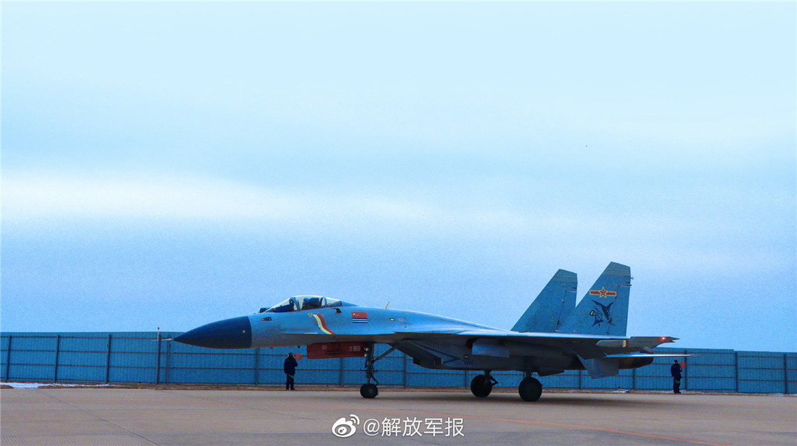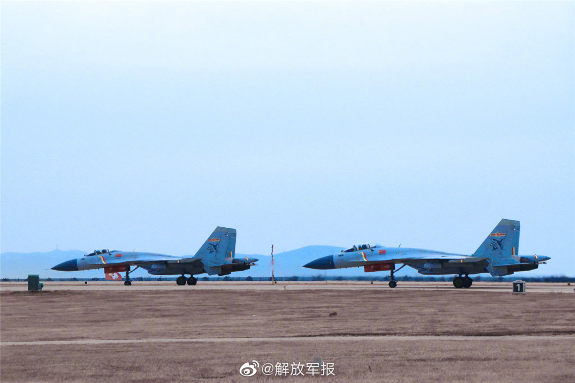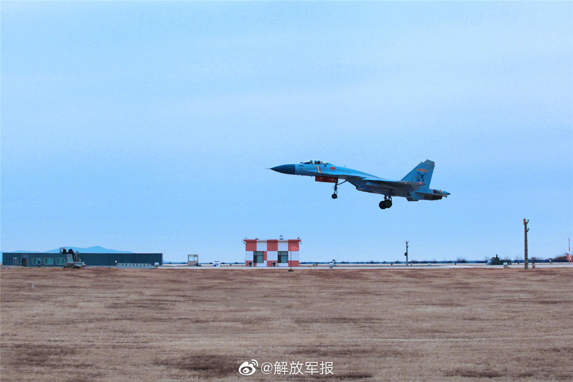 1月6日,海军航空大学某试训基地战鹰列阵,引擎轰鸣。随着指挥员一声令下,数架歼-15舰载战斗机加力升空,直刺苍穹!低空机动与导航、陆基模拟着舰等多个课目训练依次开展。